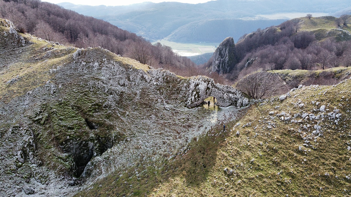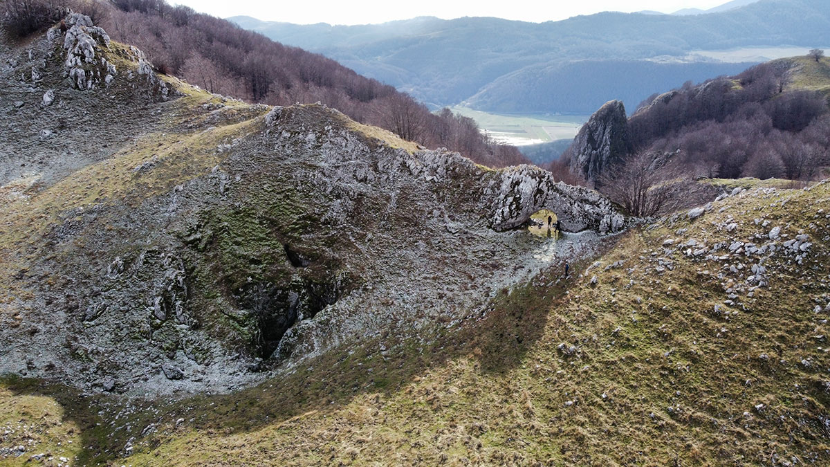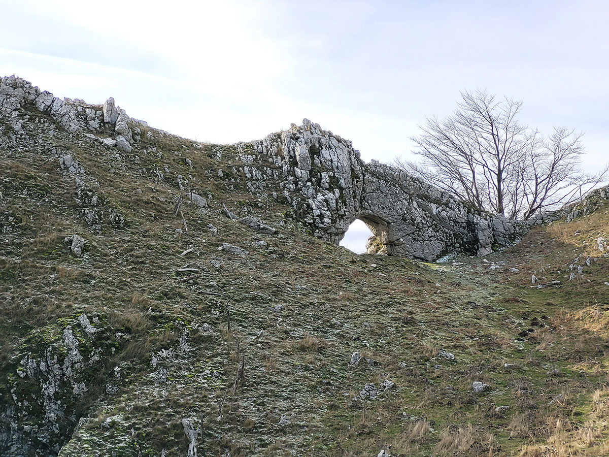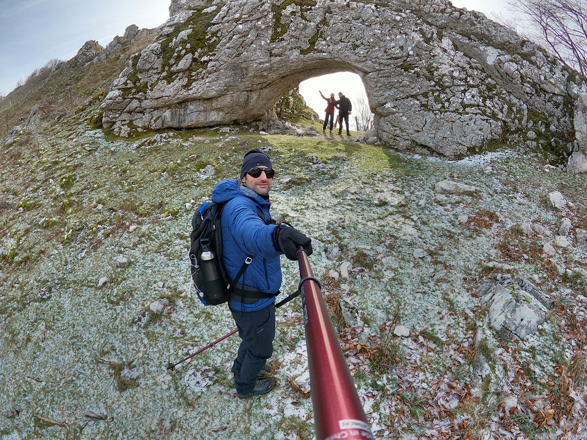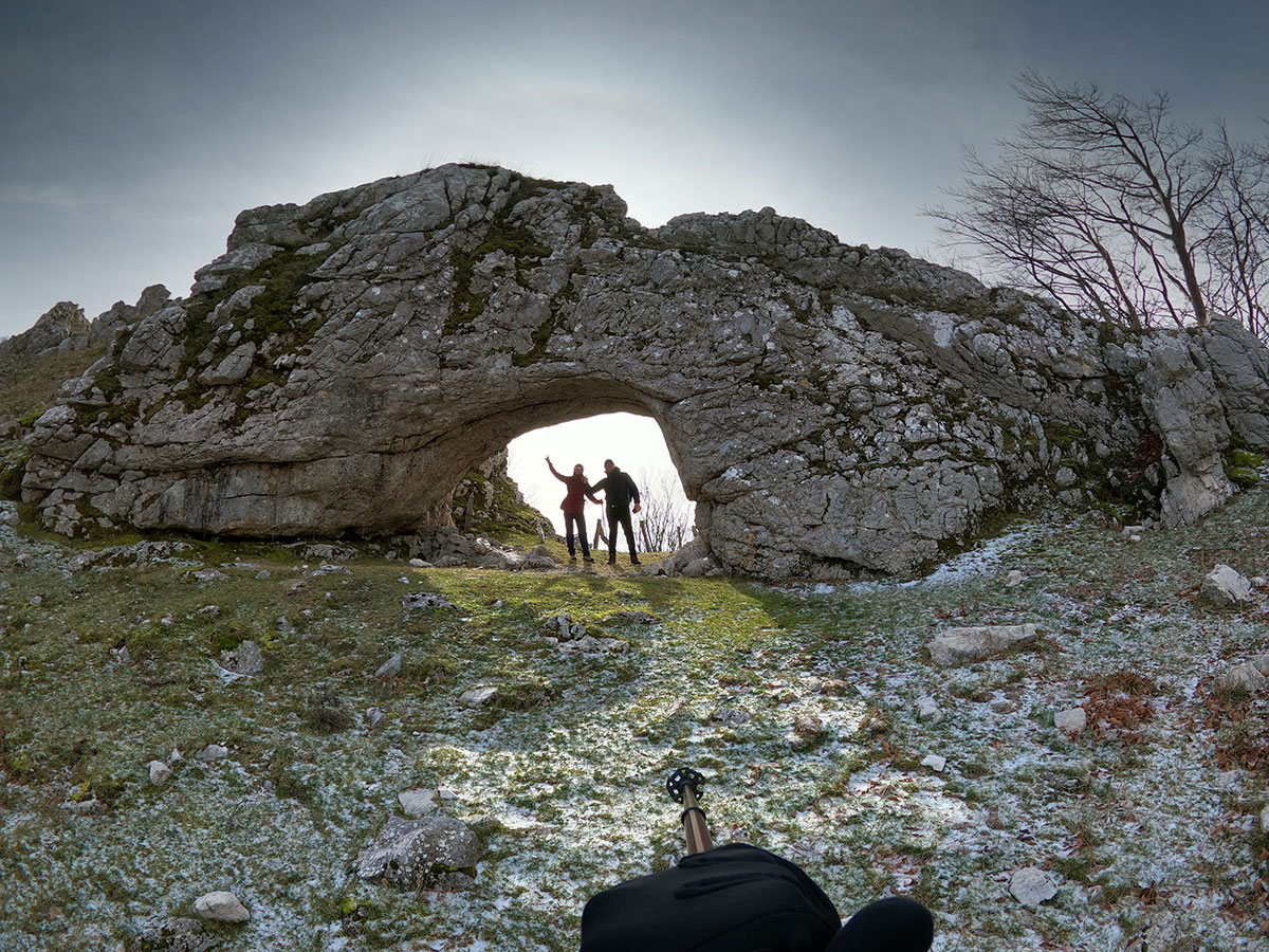 L'Arco naturale si presenta di fronte a noi in tutta la sua grandezza, una struttura davvero unica e rara, ovviamente le foto di rito sono obbligatorie e sotto la sua ombra decidiamo di fermarci per consumare il nostro pranzo al sacco. Ci godiamo il luogo che ci sembra isolato migliaia di chilometri dalla civiltà, intorno a noi vediamo solo le vette del matese e i suoi fantastici altopiani, affacciandosi oltre l'arco si scorge a malapena il lago matese, che vedremo comunque nei successivi chilometri che ci rimangono per chiudere l'anello. Ci troviamo in una zona molto particolare, in un certo senso mi ricorda i paesaggi narrati da Tolkien nel Signore degli Anelli, teatro delle avventure fantastiche di Frodo e della sua compagnia. Le terre alte del matese sono incontaminate e da sempre rappresentano un luogo magico, fortemente radicato nel cuore di chi ama l'avventura e la scoperta.