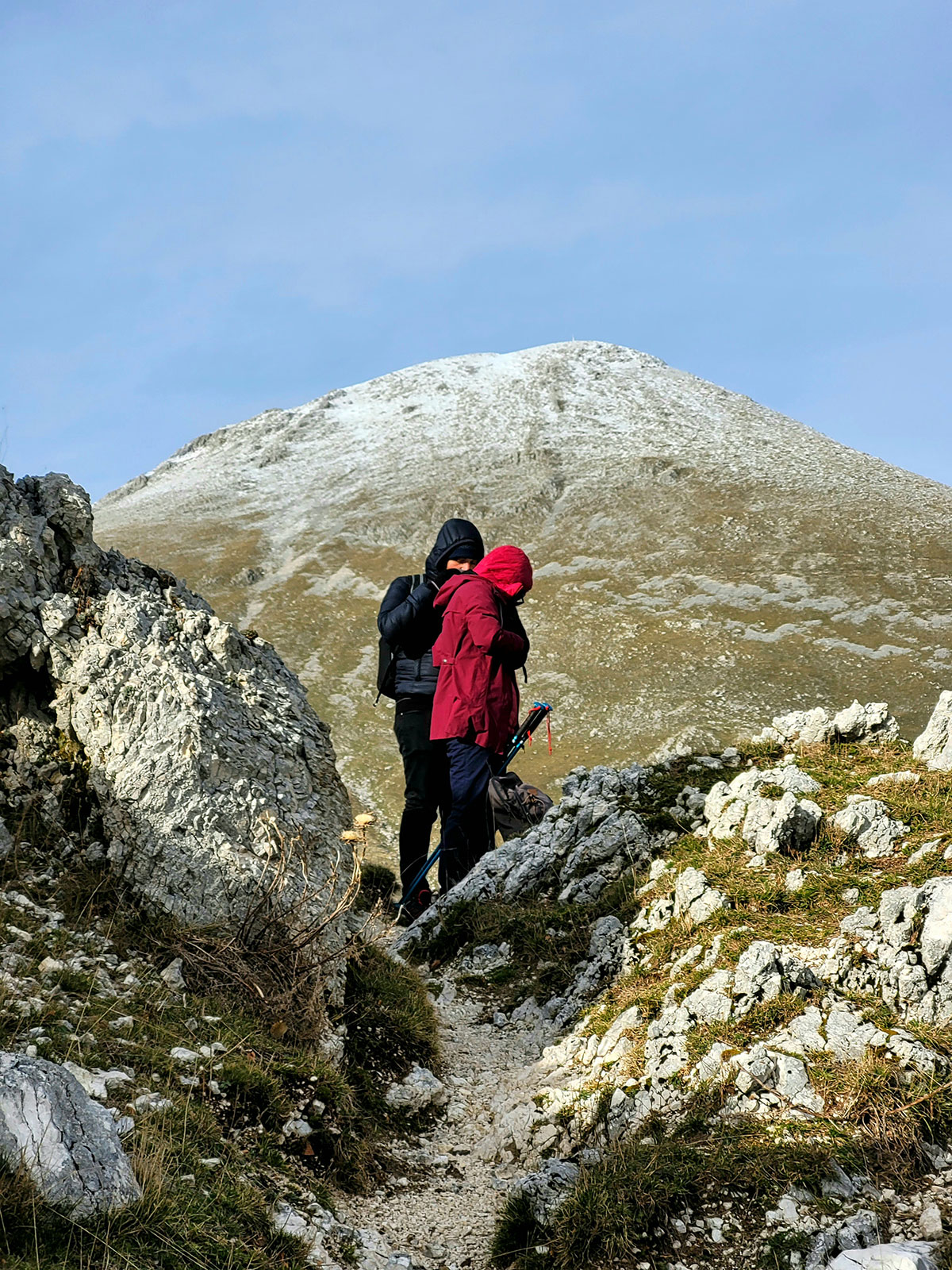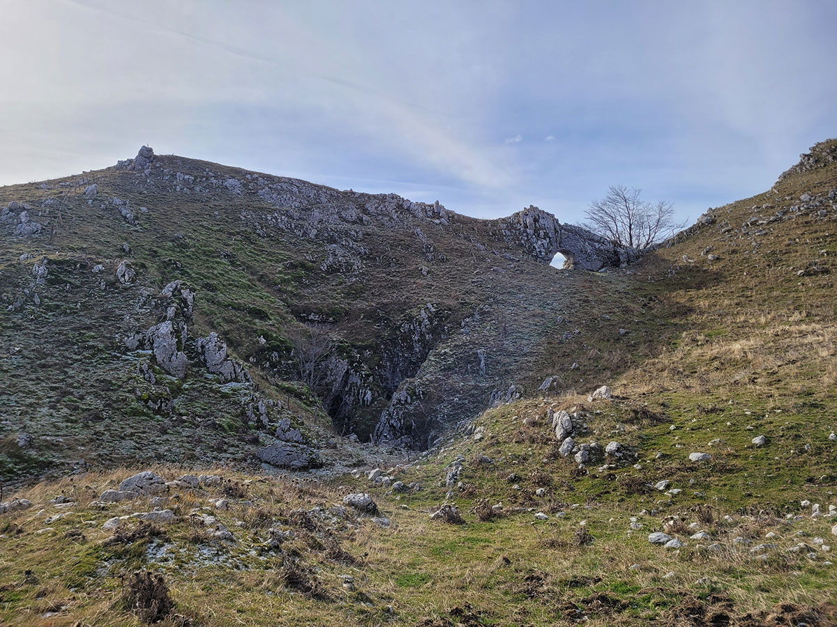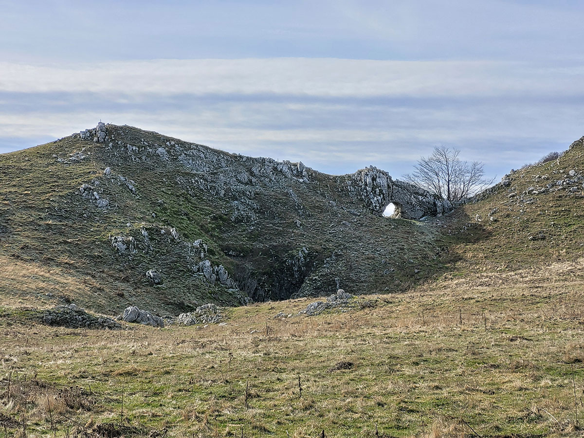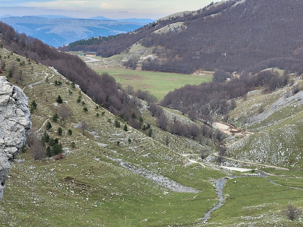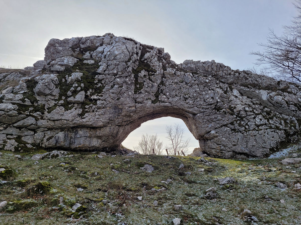 L'Arco naturale si presenta di fronte a noi in tutta la sua grandezza, una struttura davvero unica e rara, ovviamente le foto di rito sono obbligatorie e sotto la sua ombra decidiamo di fermarci per consumare il nostro pranzo al sacco. Ci godiamo il luogo che ci sembra isolato migliaia di chilometri dalla civiltà, intorno a noi vediamo solo le vette del matese e i suoi fantastici altopiani, affacciandosi oltre l'arco si scorge a malapena il lago matese, che vedremo comunque nei successivi chilometri che ci rimangono per chiudere l'anello. Ci troviamo in una zona molto particolare, in un certo senso mi ricorda i paesaggi narrati da Tolkien nel Signore degli Anelli, teatro delle avventure fantastiche di Frodo e della sua compagnia. Le terre alte del matese sono incontaminate e da sempre rappresentano un luogo magico, fortemente radicato nel cuore di chi ama l'avventura e la scoperta.