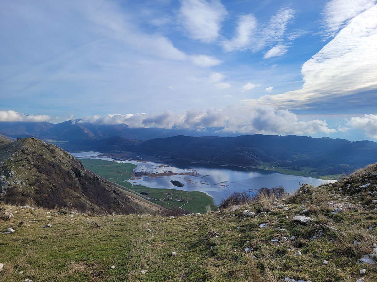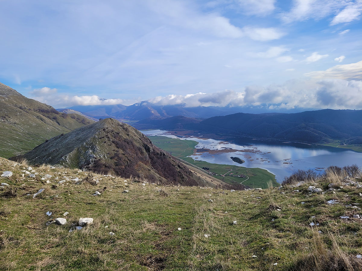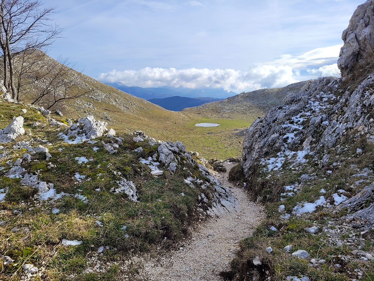 Dopo una lunga sosta decidiamo di riprendere il cammino, torniamo sui nostri passi e dopo poche centinaia di metri deviamo dal precedente percorso in direzione del lago matese. Qui seguiamo un sentiero che ci porta a passare per un piccolo valico, molto suggestivo perché di fronte e a noi ci accoglie una dolina carsica piena di acqua ghiacciata mentre alle nostre spalle lasciamo la maestosa cima del Monte Miletto. Poco più avanti il sentiero si apre e lascia spazio ad una stupenda vista del lago matese, ci troviamo in un bellissimo punto panoramico e grazie alla giornata particolarmente tersa riusciamo a vedere anche i più piccoli dettagli del paesaggio che ci circonda. Continuiamo a costeggiare la montagna e dopo un pò il sentiero si sviluppa rientrando nella zona interna degli alti piani, qui ci aspetta l'ultima salita che pian piano ci riporterà verso la sorgente Capo D'Acqua per poi rientrare a Campitello Matese seguendo la stessa strada dell'andata. Un'escursione davvero bella, d'altronde il matese non delude mai, si tratta di un trekking non eccessivamente impegnativo, da fare un pò tutto l'anno magari evitando i periodi di forte caldo o quando la neve è eccessiva. Data la quasi scarsità di indicazioni o segnavia CAI consiglio fortemente l'uso di un dispositivo GPS o un applicazione smartphone con mappe offline, in queste zone perdersi è un attimo soprattutto se non si ha una grande esperienza nell'orientamento in montagna.