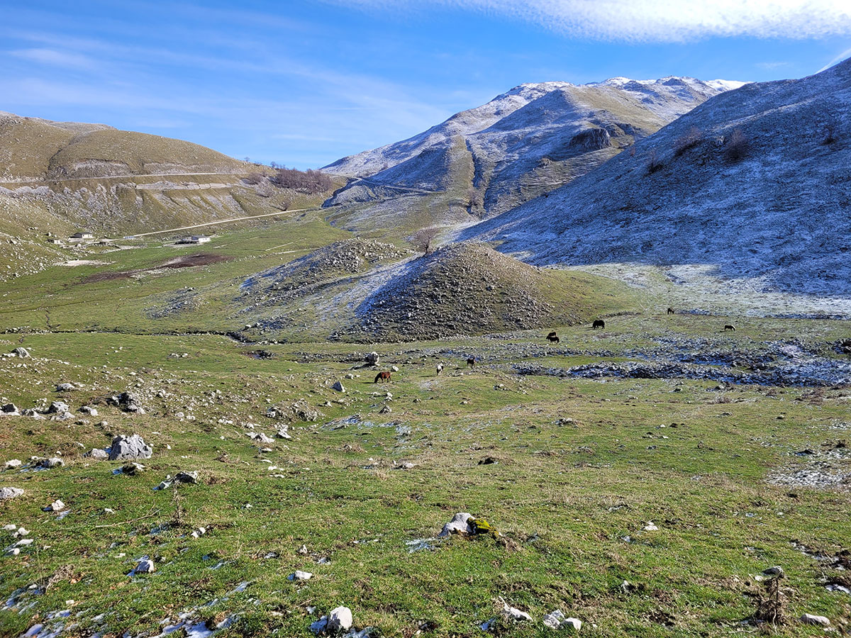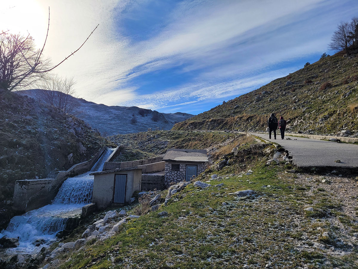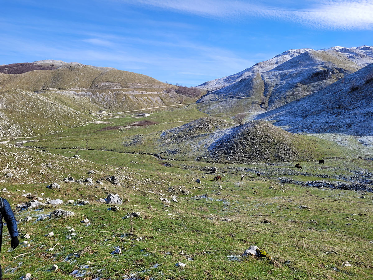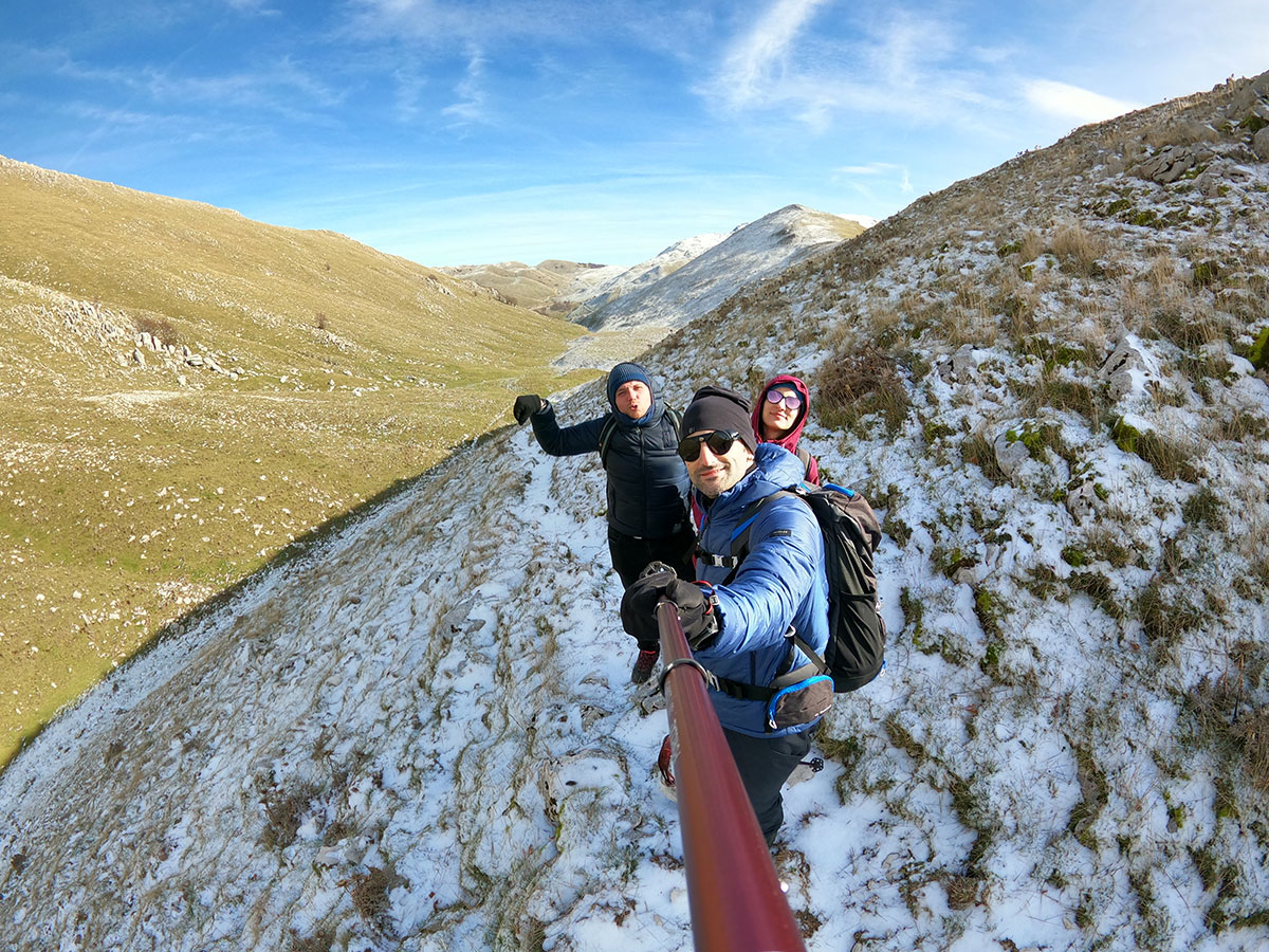 Dopo una lunga sosta decidiamo di riprendere il cammino, torniamo sui nostri passi e dopo poche centinaia di metri deviamo dal precedente percorso in direzione del lago matese. Qui seguiamo un sentiero che ci porta a passare per un piccolo valico, molto suggestivo perché di fronte e a noi ci accoglie una dolina carsica piena di acqua ghiacciata mentre alle nostre spalle lasciamo la maestosa cima del Monte Miletto. Poco più avanti il sentiero si apre e lascia spazio ad una stupenda vista del lago matese, ci troviamo in un bellissimo punto panoramico e grazie alla giornata particolarmente tersa riusciamo a vedere anche i più piccoli dettagli del paesaggio che ci circonda. Continuiamo a costeggiare la montagna e dopo un pò il sentiero si sviluppa rientrando nella zona interna degli alti piani, qui ci aspetta l'ultima salita che pian piano ci riporterà verso la sorgente Capo D'Acqua per poi rientrare a Campitello Matese seguendo la stessa strada dell'andata. Un'escursione davvero bella, d'altronde il matese non delude mai, si tratta di un trekking non eccessivamente impegnativo, da fare un pò tutto l'anno magari evitando i periodi di forte caldo o quando la neve è eccessiva. Data la quasi scarsità di indicazioni o segnavia CAI consiglio fortemente l'uso di un dispositivo GPS o un applicazione smartphone con mappe offline, in queste zone perdersi è un attimo soprattutto se non si ha una grande esperienza nell'orientamento in montagna.